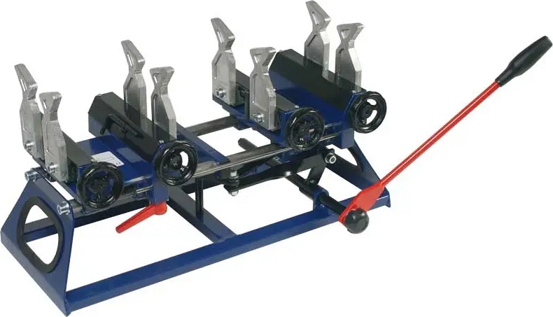 - Имеет по 2 зажима для труб и фитингов с каждой стороны. Каждый из 4-х зажимов сводится и разводится вращением зажимной рукояти соответствующего зажима, независимо от других зажимов. Это позволяет производить сварку труб электромуфтами или даже сварку стальных труб